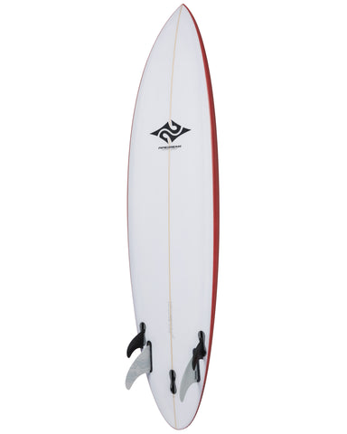 Being basically a twin fin and particularly a round tail I have flattened the tail rocker a tad more so it retains some reach. The nose lift is also flattish since it has the lift of the cathedral hull. Being such an easy design to turn keeping a thicker rail is fundamental in enhancing drive in what you could call a very pivotal concept.