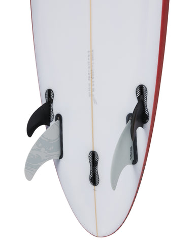This is where the big changes occur c/f the original Twinzaa. This new more commercial design is not as radical and the fin sets are more moderately positioned and more importantly do not need the radical tilted Hornet fins that HAD to go with its older brother. Having said that there is still a difference with fin positions on this model c/f the standard twinzer you see coming back on to the market. The alpha twin fin is set further in from the rail that the conventional Twin fin positions or Twinzers positions, but not as far as my hard core Twinzaa model since the fin I have chosen for this new model does not have the excess lean of the Hornets. The fin for this does have more lean than a normal twin fin and enough to comfortably place these fins in from the rail an inch more than the norm. This allows me to keep these fins more parallel to the stringer, but not as much as the Hornets which are almost parallel because they lean out so much. This placement will not reduce face hold but will help the heel and toe have more sway with quicker rail to rail transitions.